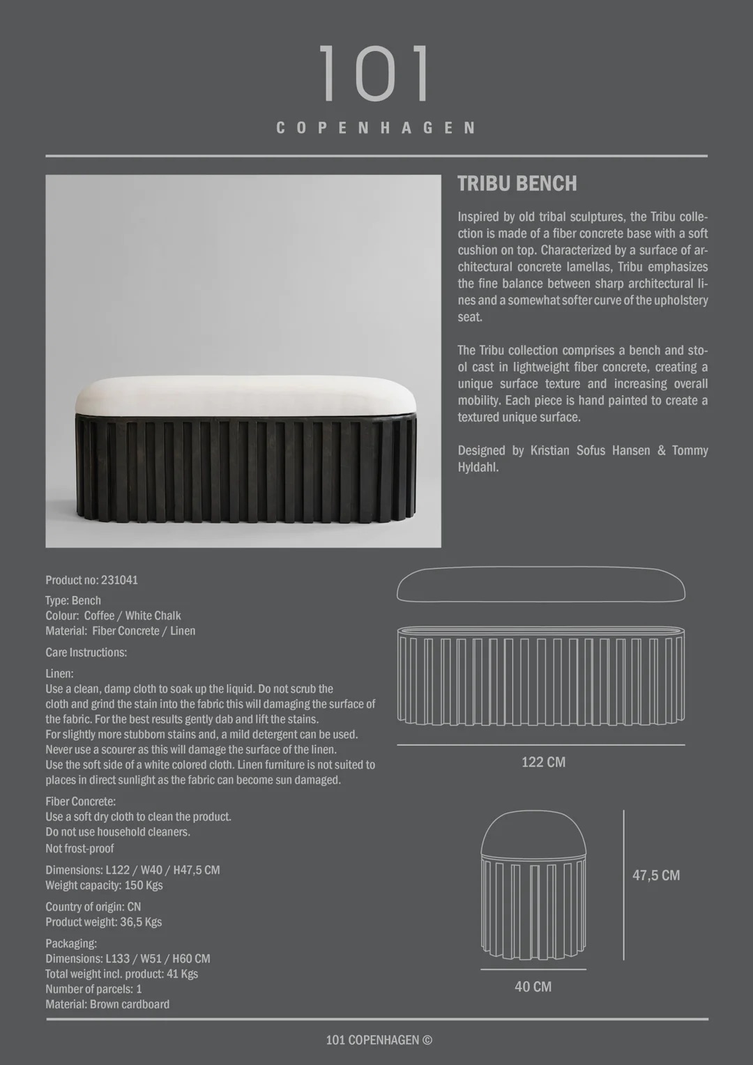 Inspired by old tribal sculptures, the Tribu collection is made of a fiber concrete base with a soft linen cushion on top. Characterized by a surface of architectural concrete lamellas, Tribu emphasizes the fine balance between sharp architectural lines and a somewhat softer curve of the upholstery seat.