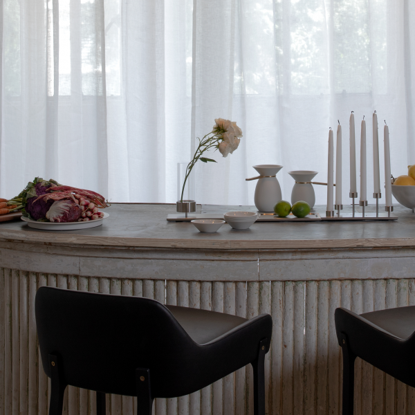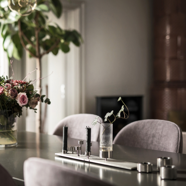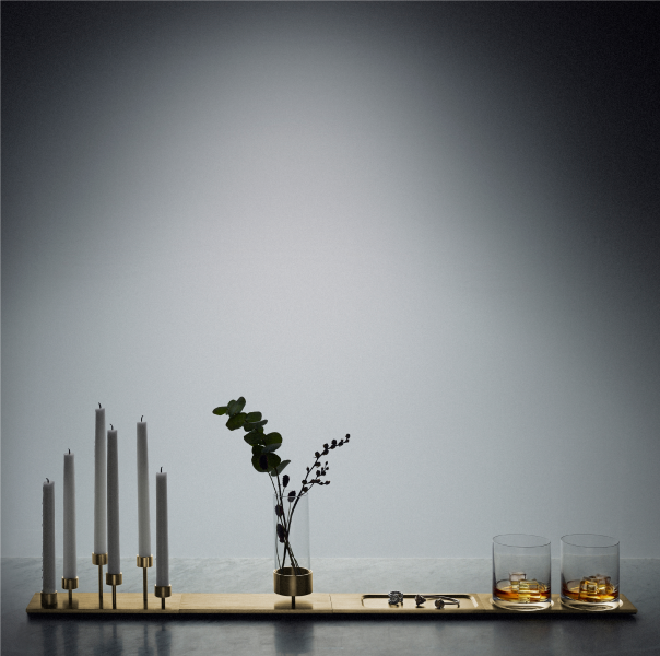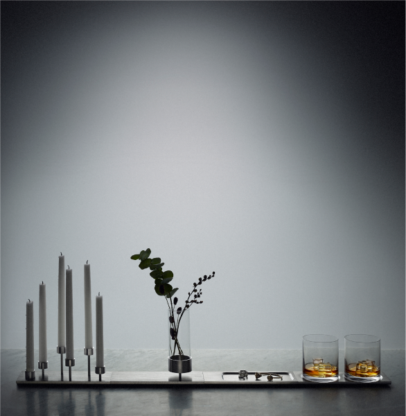 In the MACHINED series, you will also find other products that have been laboriously created in six-millimeter steel, brass, or black metal to enhance your interior. You can place the accessories individually or playfully combine them to create a unique festive table setting. The collection includes a floral vase, whisky glasses, a candle holder, and a tray.