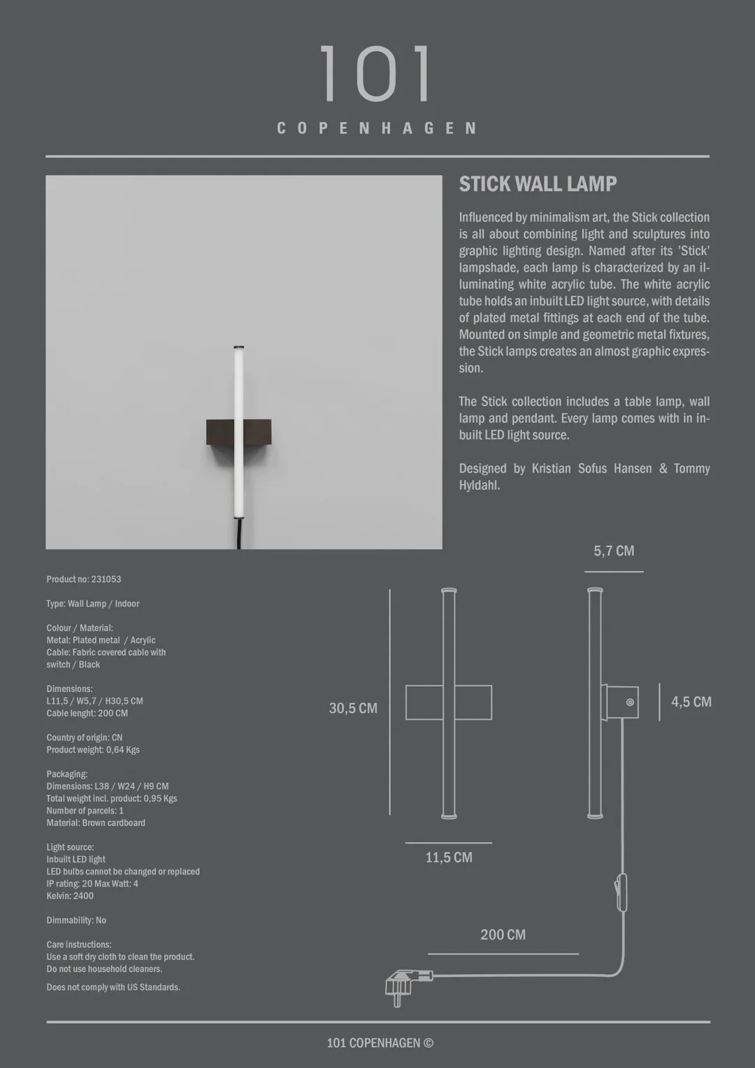 Influenced by minimalism art, the Stick collection is all about combining light and sculptures into graphic lighting design. Named after its ’Stick’ lampshade, each lamp is characterized by an illuminating white acrylic tube. The white acrylic tube holds an inbuilt LED light source, with details of plated metal fittings at each end of the tube. Mounted on simple and geometric metal fixtures, the Stick lamps creates an almost graphic expression.
