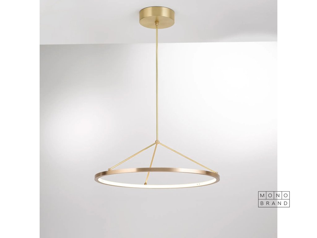 Toto kruhové závěsné svítidlo se skládá z velkého masivního mosazného kruhu osazeného LED světly pouze na vnitřní straně. Kruh rovnoměrného světla připomínající svatozář je zavěšen na síti tří mosazných stonků, které se sbíhají v jeden a v pevném bodě se setkávají se stropem. Výsledný závěs se jakoby bez námahy vznáší ve vzduchu a vrhá na strop sošné stíny.